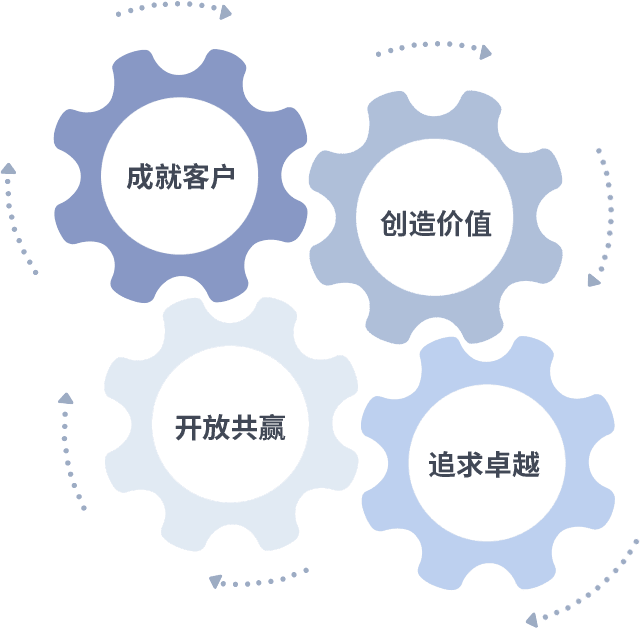 成就客户是一切决策的出发点,,,创造价值是衡量所有工作的标准,,,,追求卓越是我们做事做人的态度,,,开放共赢是我们的格局也是最终的结果。。。。价值观的齿轮环环相扣,,,,推动着组织里的每个人不断向前。。
