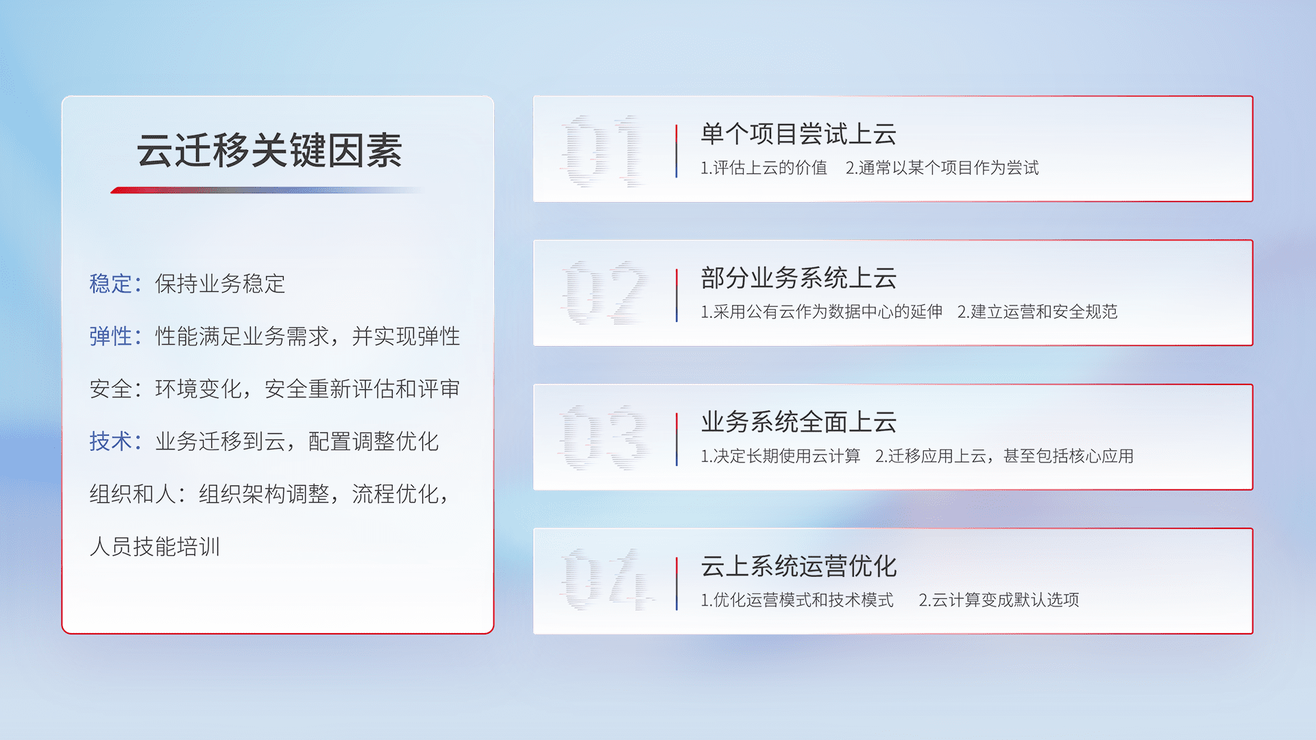 结合实际业务,,,,从规划设计、、云平台选型、、云原生改造、、数据迁移、、集成交付,,,,迁移全过程为客户识别最佳上云路径,,做好风险识别管理,,,,设计网络架构、、、、身份权限、、、、安全审计合规、、、操作审计、、、日志审计、、、、监控告警策略、、、、多站点容灾设计等,,对云上基础设施进行整体规划,,,,提升IT治理水平,,以满足弹性、、高可用、、高性能的需求。。。。