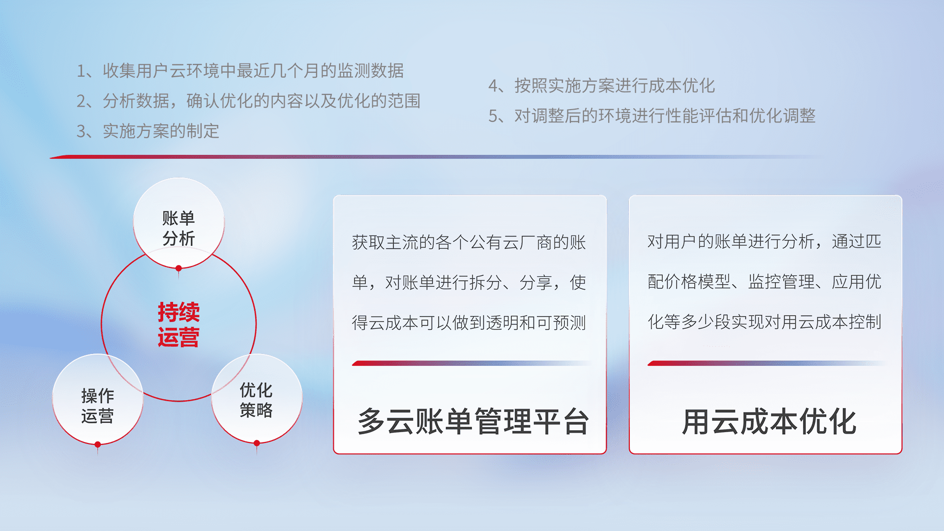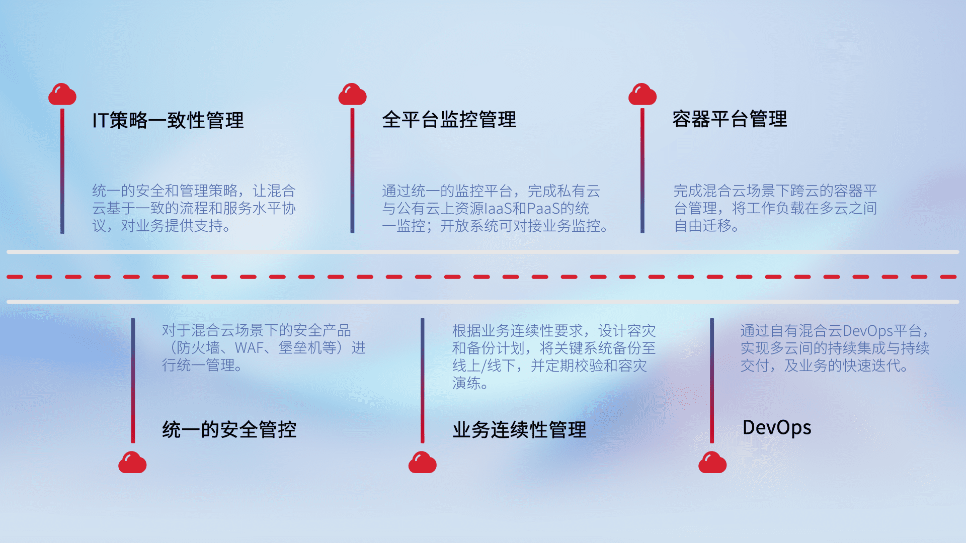 通过多云纳管,,,以统一的资源数据模型把客户的云资源进行抽象和封装,,,,进而实现对多云资源的统一操作,,,,保障云资源管理的可靠性、、稳定性与可用性。。。量身定制化运维内容,,,配置、、、、开发运维、、、补丁管理、、、备份、、、、监控、、、认证和访问管理、、、审计和日常巡检等,,,保障在用云过程中的可靠度,,,,稳定度以及高可用率。。