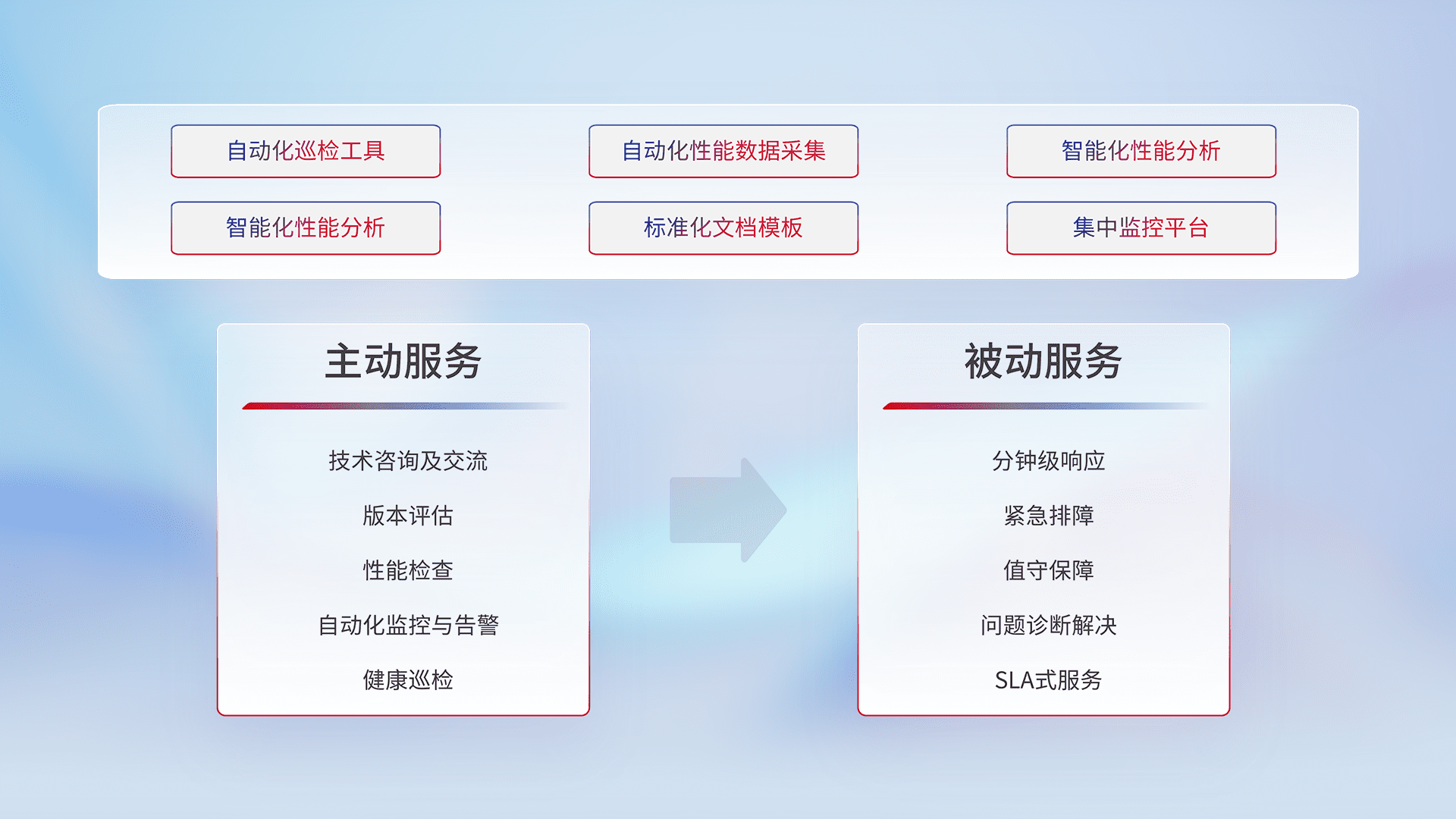 智能化工具和标准化文档,,保障服务质量,,,提供主动服务(包含技术咨询、、、版本评估、、、、性能检查、、自动化监控与告警、、健康巡检)和被动服务包含(分钟级响应、、、、紧急排障、、值守保障、、问题诊断解决、、、SLA服务)。。